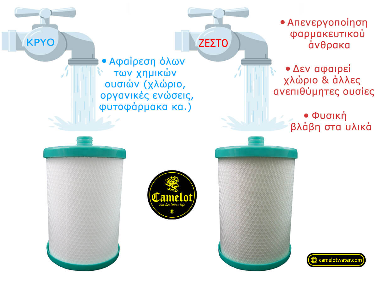 The ζεστό νερό μπορεί να προκαλέσει αλλοίωση στα υλικά φιλτραρίσματος και να μειώσει δραστικά την αποδοτικότητά τους. Οι περισσότερες μεμβράνες και ο ενεργός άνθρακας είναι σχεδιασμένα να λειτουργούν σε θερμοκρασίες κάτω των 30°C.